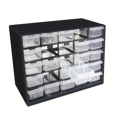 Skapa ordning och reda med våra 25-lådiga förvaringslådor! Perfekta för att organisera muttrar, bultar och smådetaljer. Genomskinlig design gör det enkelt att hitta rätt verktyg, och varje låda är utrustad med ett inbyggt stopp för att förhindra spill. Tillverkade av slitstark ABS-plast, kan de användas fristående eller monteras på väggen, vilket gör dem idealiska för garage, reparationsverkstäder och verkstäder. Håll dina verktyg och tillbehör tillgängliga och välorganiserade.