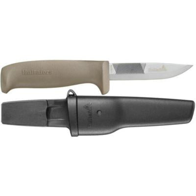 Knife blade with file for deburring. Blade of 2.5 mm stainless steel. Hardened to HRC 57-59. Sheath made of extra impact-resistant PP plastic. Function to fasten the sheath around the button of the professional clothes, so that it does not come off, while it is easy to remove.