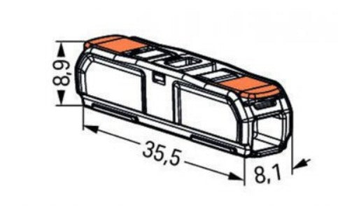 Splicing clamp for all types of CU conductors. The conductor is connected by raising the orange arm, inserting the stripped conductor and returning the arm. Equipped with test hole.