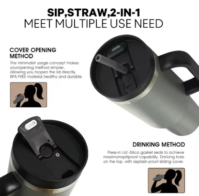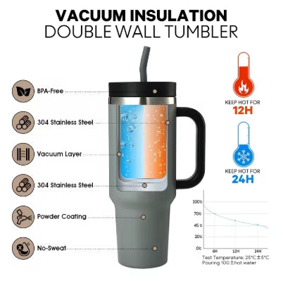 Denna 40 oz isolerade mugg med sugrör är ett perfekt val för dig som behöver långvarig temperaturhållning under hela dagen. Muggen är tillverkad av högkvalitativt rostfritt stål och har en dubbelväggad vakuumisolering som håller drycker kalla upp till 24 timmar och varma i många timmar. Den är utrustad med ett stabilt handtag, ett tätt lock och ett praktiskt sugrör – idealisk för kontoret, resor, träning eller daglig användning. Med modern design, hög hållbarhet och säker konstruktion erbjuder den en bekväm och pålitlig dryckesupplevelse.