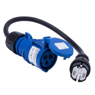 Övergång från 400V till 3x230V Schuko. Grenuttag med självstängande lock. Anslutningskabel RDOE (H07RN-F) 5G1,5 och stickpropp CP 416-6 CEE. Godkänd för utomhusbruk, IP44.